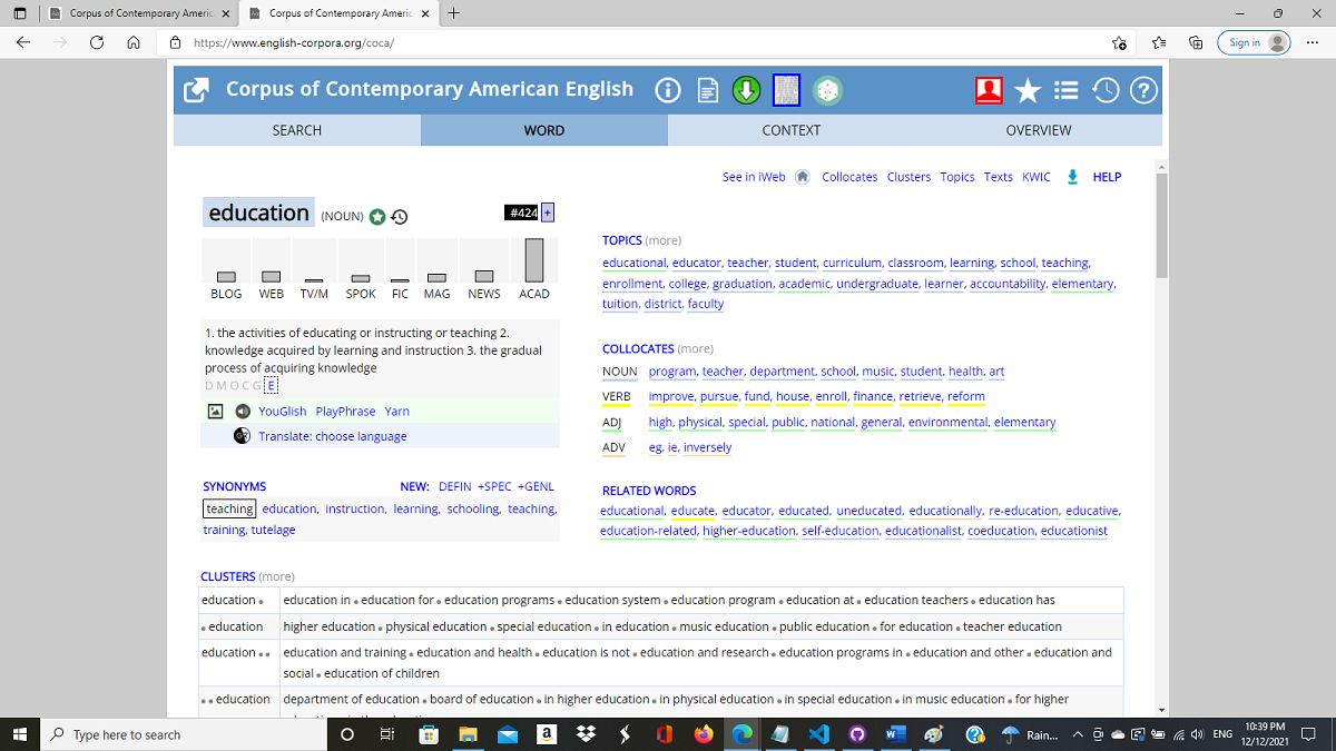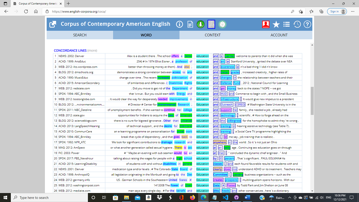 In the following couple of images, you can see how our keyword 'education' is analyzed in the COCA database. COCA contains millions of words collected from multiple sources. Academic articles are indicated with "ACAD" in the left column, "WEB" for the Web/Internet. It also shows in a graph the frequency of sources, in this ACAD is quite high.