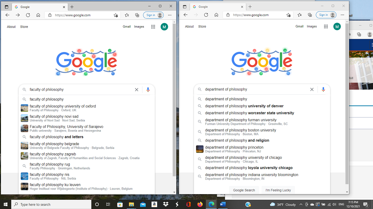 Language Technology and Corpora or Corpus Linguistics is a field which has really blossomed as computer technology has become more advanced and accessible. We can now gather, process, analyze, and learn from vast amounts of language data very easily and quickly. This screenshot demonstrates this concept. Here I did two searches, one using the term "faculty of philosophy" and the other "department of philosophy". As you can see by the locations of universities, the two terms can determine which results will appear. Website meta data can help Google determine sites it will detect. It is evident from this one example that European universities use the term "faculty" in a similar manner to how American universities use "department."