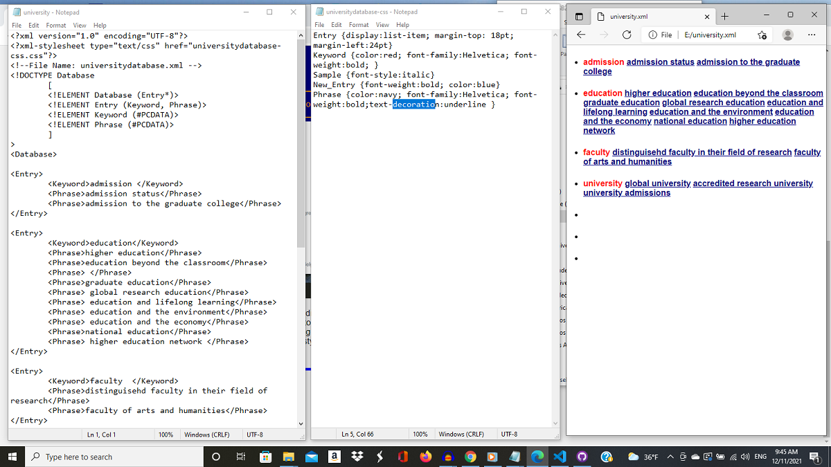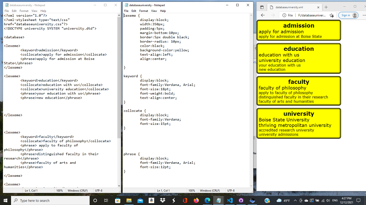 The following image shows the XML file, associated style sheet, and browser view of keywords and phrases I have been developing in my research of academic keywords and phrases on university websites. Should I ever be working with adding meta data to a university website, I can refer to this database to help me come up with keywords and phrases appropriate to such a website.