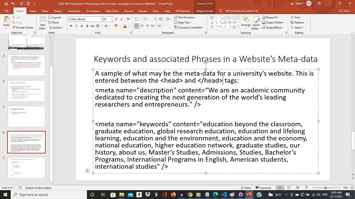 This is part of my presentation on keywords and phrases and how they are integrated into a website's meta-data. If you want to give your website specific meta-data that may help people searching find your site, you can add a meta-data section between the head tags. Just replace this university language with words and phrases specific to your website's subject matter.
