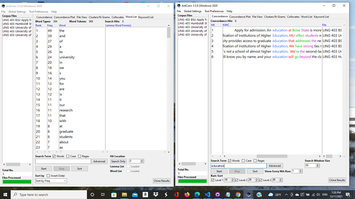 The following images can give you an idea how a program like AntConc works. In the first screenshot on the left is a word frequency count of the collection of language I gathered from American university web sites. Greater frequency is near the top. The second is how the word 'education' appears in relation to other words and what phrases it may trigger by using AntConc's concordance tool.