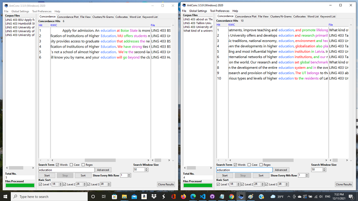 Different corpora can be compared. Here I have the American corpus concordanced on the left, the European corpus on the right. This reveals how the two "Englishes" use the word education and various phrases associated with the word.