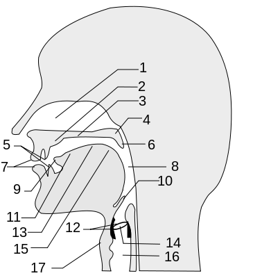 1. Nasal cavity 2. Alveolar ridge 3. Hard palate 4. Soft palate (Velum) 5. Teeth 6. Uvula 7. Lips (Labia) 8. Pharynx 9. Tip of tongue 10. Epiglottis 11. Blade of tongue 12. Vocal cords 13. Front of tongue 14. Glottis 15. Back of tongue 16. Wind pipe (Trachea) 17. Larynx